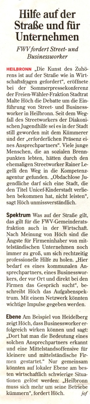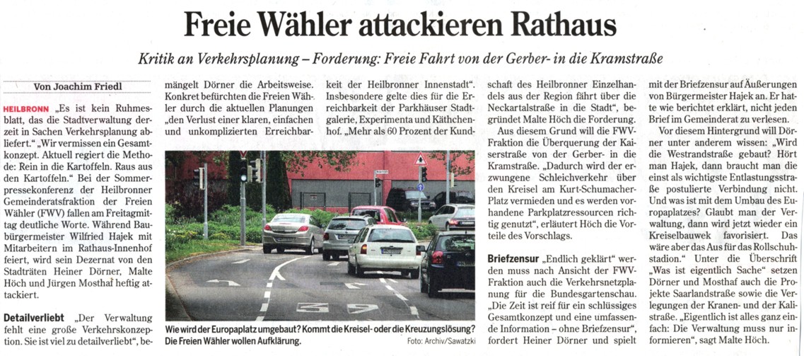Hier nur einige Beispiele der letzten Monate ohne merkliche Beteiligung der CDU: Einsatz für die Beschäftigten der Stadt (Reinigungsdienst), Gemeinschaftsschule, Optimierung des Standortmarketings von Heilbronn, seriöse Haushaltsführung, Gleisbrücke zum Neckarbogen, Trinkwasserresolution wegen EU-Gesetzesvorhaben, Bauvorhaben Badener Hof (Bürgeraktion) und daraus resultierend gemeinsamer Antrag Baumschutzverordnung, Bauvorhaben Schloss Horkheim mit Einbeziehung des Bürgerwillens u.a.