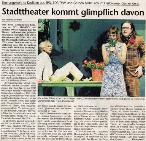 Meine sehr geehrten Damen und Herren. Eine Zuschuss-Zahlenreihe wird heute bis 2008 beschlossen. Mit diesem Beschluss werden wir aber dem Auftrag eines Theaters in der Region, im Oberzentrum Heilbronn, nicht gerecht.